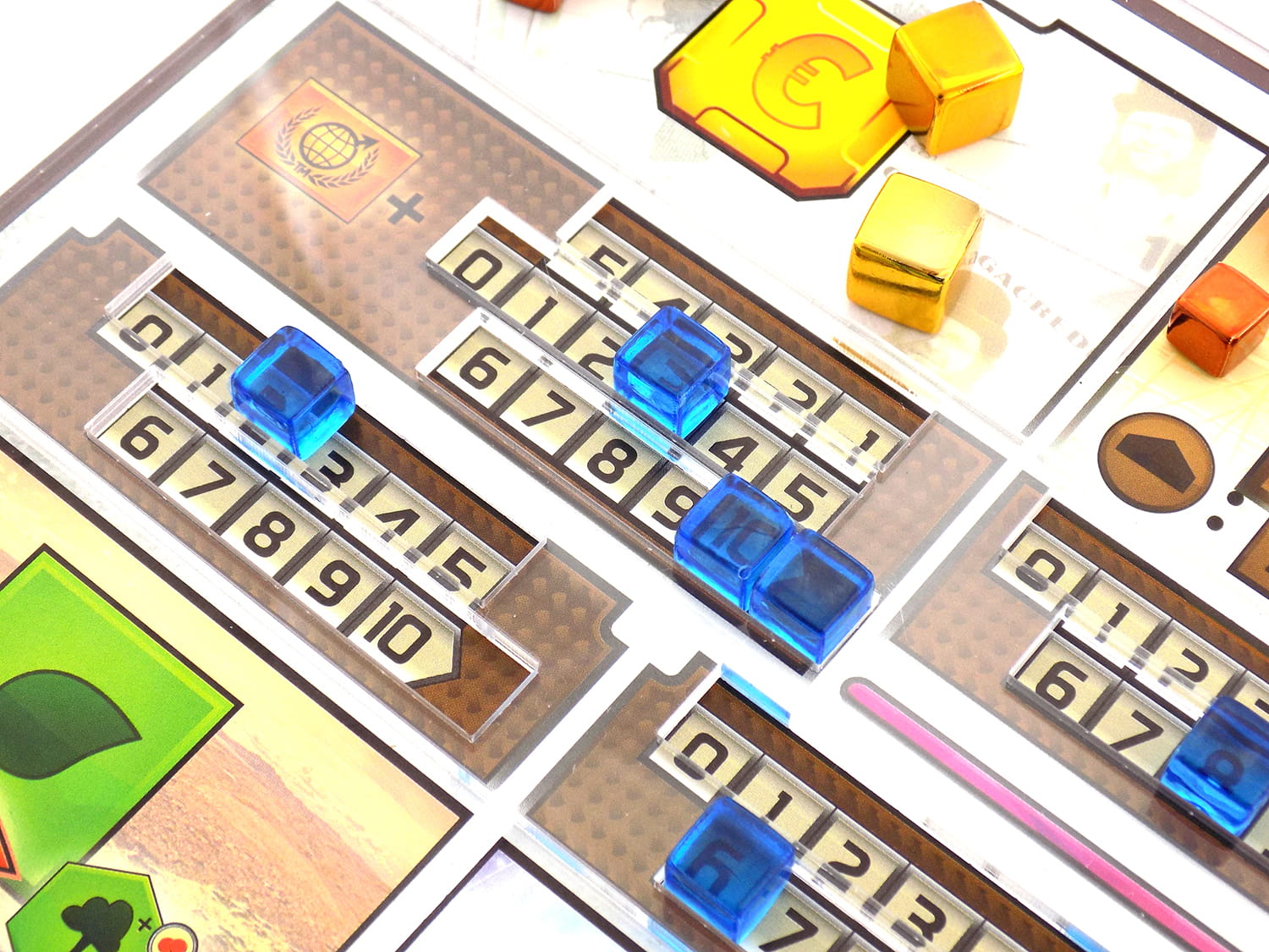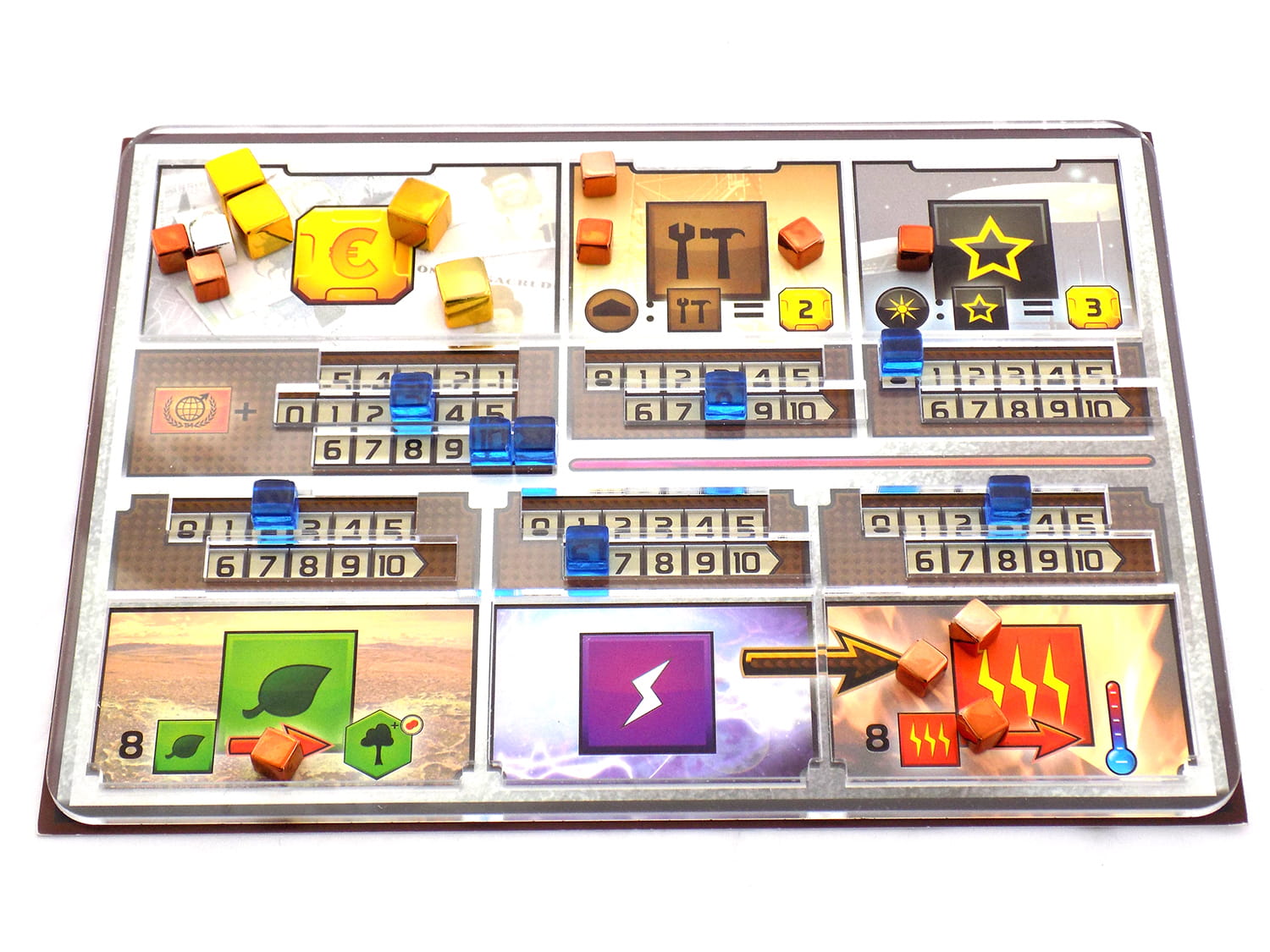 Organizer pomaga w utrzymaniu porządku na planszy gracza poprzez zminimalizowanie ruchu znaczników zasobów. Dodatkowo nasz produkt zawiera dodatkowe pole, które pozwala w bezpieczny sposób zaznaczać poziomy produkcji 20-29 bez stawiania znaczników na siebie.